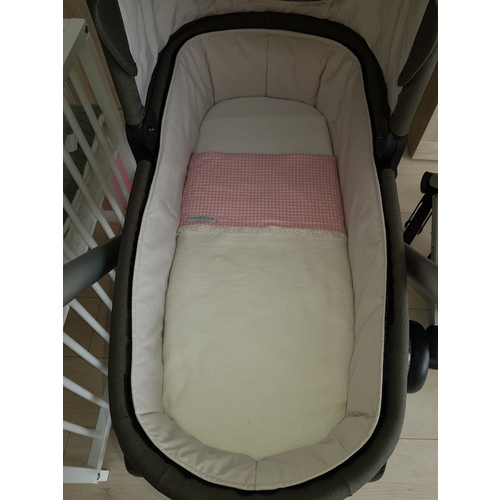 Ik heb eigenlijk voor alles (ledikant, co-sleeper en kinderwagen) dezelfde ‘volgorde’. Molton, hoeslaken en laken/deken. Wij hebben een co-sleeper van tutti bambini en die heeft aparte maten, dus daar moest ik ook eigen merk dingen van aanschaffen. Lakentje en dekentje van wiegformaat past dan wel weer zowel in de co-sleeper als kinderwagen.