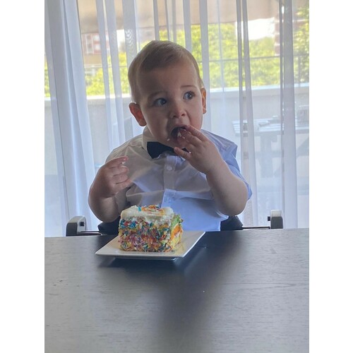 We hebben de Red Velvet cake van HEMA in hartjes vorm besteld met een mooie foto collage erop van ons ventje 🍰🤤 erg tevreden mee