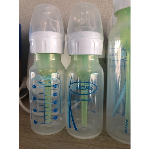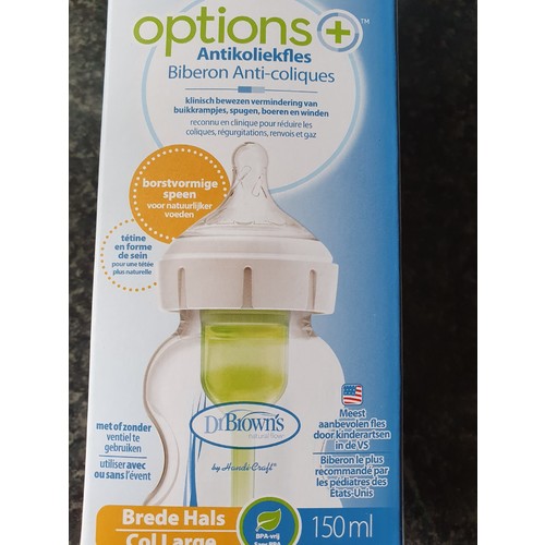 Hier ook dr Brown smalle hals fles wanneer kindje borstvoeding gewend is kan je heel lang met de eerste speen. Beter voor het maagje wanneer het afgekolfde melk krijgt.