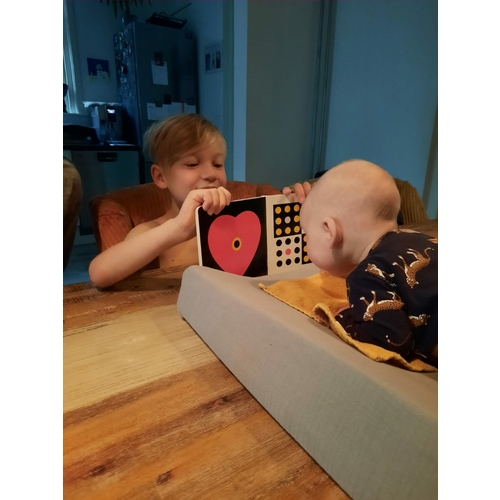 Hij heeft net een minuut of 2/3 zo gezeten op het voedingskussen. Vanmorgen bij de fysio lag zijn hoofd er gewoon op. Vandaag een aantal keer kort wat geoefend op verschillende manieren. Dit volhouden denk ik, oefende eerst ook wel maar steeds gewoon op de bank en dan zijn armpjes er onder, dan gaat hij gewoon lekker liggen en vindt hij het prima