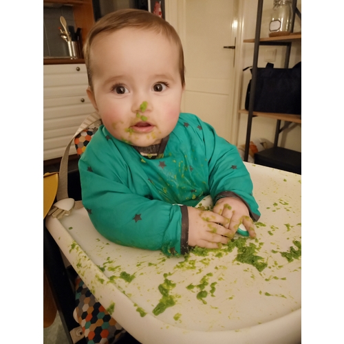 Hier nu een paar weken. In het begin moest hij veel kokhalzen maar dat is al heel veel minder. Is puur nog voor de fun en ook niet elke dag, puur als wij iets eten wat hij ook mag/kan hebben. Maak dus nog niks apart voor hem. Maar zo leuk hoe hij er zo van geniet het zelf te doen!