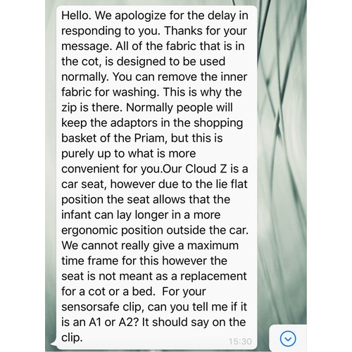 Goed dat je het checkt! Het blijft natuurlijk een autostoel. In een autostoel mogen ze 1,5uur. Deze vraag had ik ook en heb hem aan Cybex gesteld. Je kunt ze ook benaderen via whatsapp, zie hun website. Ze mogen er dus iets langer in maar ze kunnen niet zeggen hoe lang. Wel dat het geen vervanging is van de bak of bed.