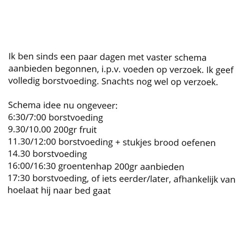 Hij is nu 7,5 maand oud. We geven gepureerd groenten en fruit, zelf gemaakt. Maar ik laat wel hem zelf bepalen hoeveel. Wil hij veel eten geven we veel (max. 200), wil hij weinig eet hij weinig (50gr). Geeft hij goed aan zelf.