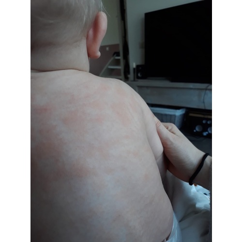 Hier ook een plek op zijn buik, ik smeer het bij het verschonen van de luier in met vette crème en daarmee trekt het weg. Zo ging het ook bij de plek op zijn bovenarm en bovenbeentjes. Dit was overigens ook het advies van het CB!