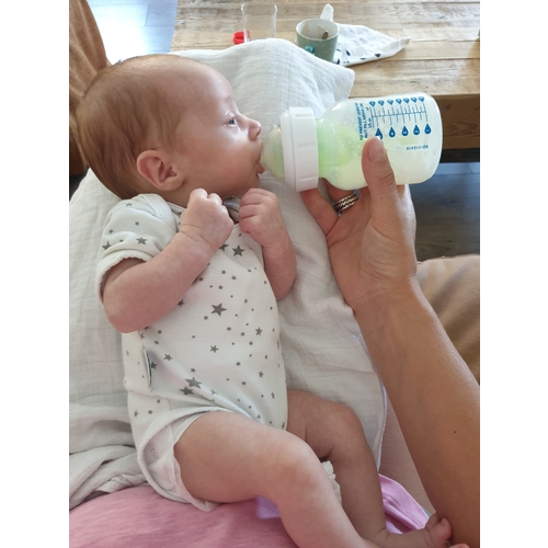 Na 5 slokjes de speen uit haar mond halen, even pauze en op adem komen, daarna weer 5 slokjes enz.