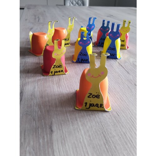 Ik ben nog niet verder gegaan hoor, maar zoiets moet het worden wat de feesthoedjes betreft. Gewoon een klein rondje uitknippen, iets minder dan een kwart eruit knippen en in een soort pijltje draaien. Gewoon met een plakbandje aan elkaar plakken en met dubbelzijdig tape op de kop van het diertje plakken..