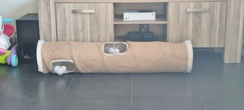 Milou kroop achter de kat aan en die sprong zijn speelbuis in. Milou er achter aan. Die stak zo haar hoofd in de middelste gat en ging recht opzitten. Buis hangend op de schouders en begon hoofd heen en weer te schudden. Die buis helemaal heen en weer 🤣😂