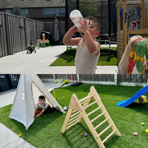Hij vind het geweldig om achter in de tuin te spelen, heel de tuin is zo goed als voor hem zelf en voor al zijn speelgoed😅. Soms verplaatsen we wat spullen. Als het regent zet ik veel dingen wat mogelijk is onder de overkapping neer. En speelt hij daar verder.