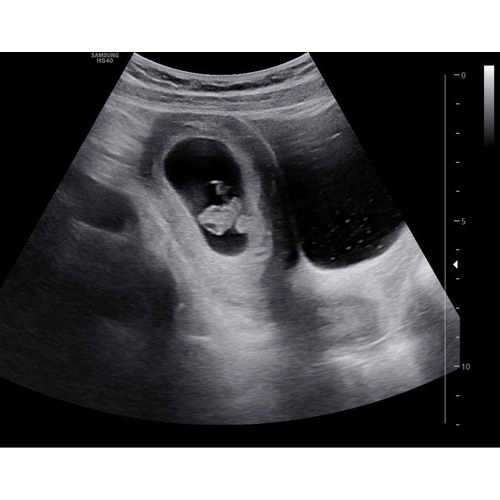Inwendige echo: placenta/dooierzakje links = meisje, rechts = jongen