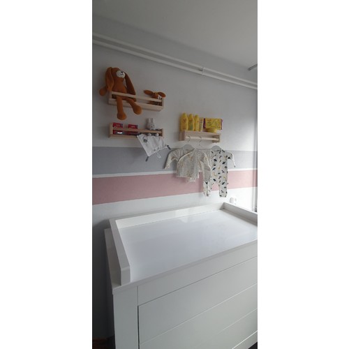 Ik heb 3 ikea kruiden rekjes boven de commode hangen. Super handig. Je kan de zelfde rekjes ook gebruiken voor kinderboeken.