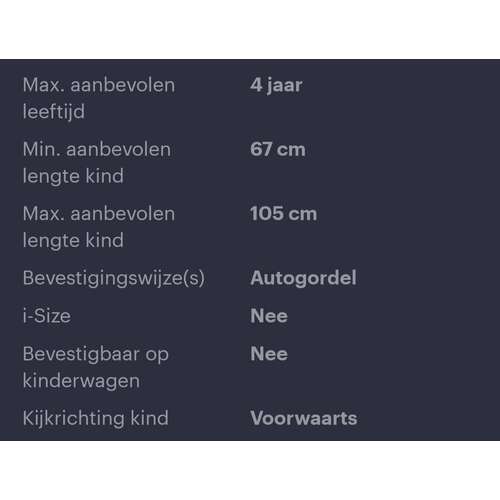Te gebruiken van geboorte tot 36 kg, heeft verschillende standen, kan draaien en heeft zo'n isofix poot die veel minder plek inneemt dan de isofix base voor de maxi-cosi. We zijn er heel tevreden mee tot nu toe.