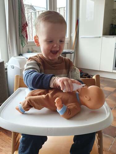 Nu geeft onze zoon (wordt in juni 2) zijn knuffeldino de fles op het moment dat zijn zusje gevoed wordt.