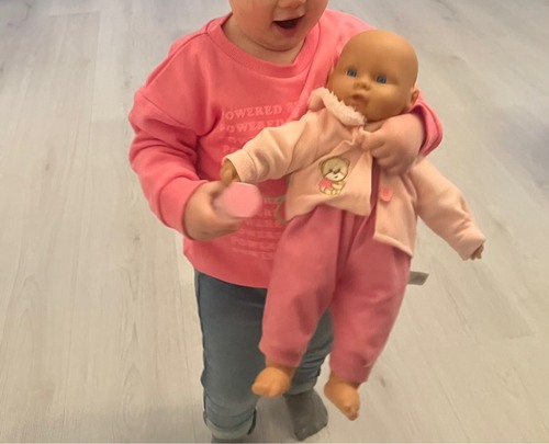Onze dochter speelt al maanden met haar poppen. Mijn eigen babyborn pop, waar ik destijds mee heb gespeeld, heeft ze van mijn moeder gekregen. En van ons een baby Annabell. En dan heeft ze nog 2 kleinere poppen, ze speelt er al heel goed en bewust mee. Verschonen, slapen, eten, spelen etc.