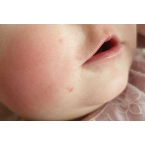 Onze zoon heeft dergelijke vlekjes een kwartier nadat hij ei heeft gegeten. Dit is de volgende dag helemaal weggetrokken en schijnt normaal te zijn bij nieuwe voeding (en dan de eerste 10 keer die nieuwe voeding zie je dit, niet alleen de eerste keer). Zou het kunnen dat ze net wat nieuws gegeten heeft?