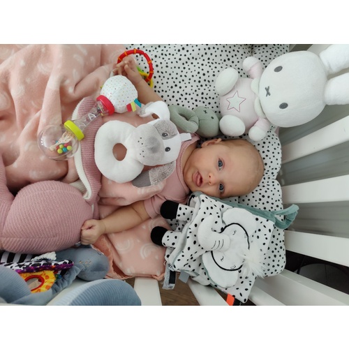 Wow wat heeft ze veel haha. Schattige foto. Mag ik vragen waar je die roze knuffel met die hangoren van hebt? Ik zie maar een klein deel 😅, maar heb toevallig vandaag internet afgespeurd naar een wat grotere knuffel met dat materiaal (nijntje hebben we al en vond vooral kleonere knuffels verder).