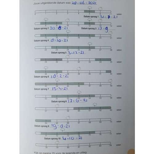 Hier een overzichtje wanneer er sprongetjes zijn. Het komt natuurlijk niet precies op de dag (let op de data zijn natuurlijk van mijn uitgerekende datum dus zullen voor jou anders zijn. Maar je kunt wel naar de weken kijken). De ene baby is sneller dan de ander en de ene heeft er meer last van dan de ander. En ook kan het per sprong verschillen hoeveel kast je kindje er van heeft.