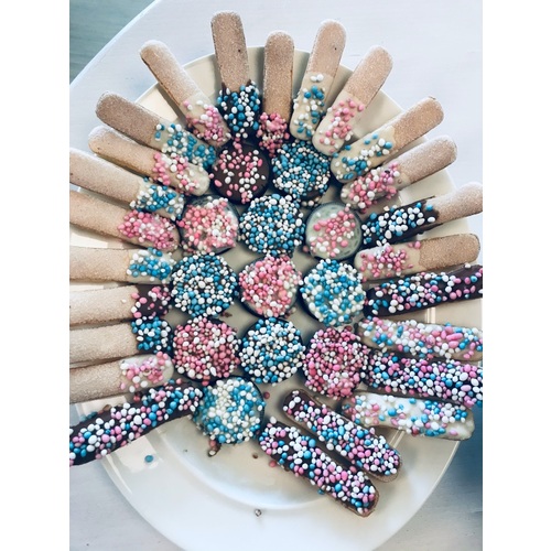 Ik weet het ook nog niet. Ik heb roze tompoucen bij de hema besteld en strooi er blauwe muisjes op.