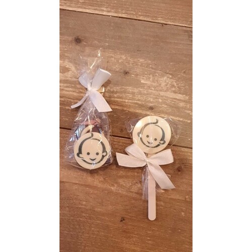 Links een zakje met chocolaatjes voor m'n collega's. Rechts een lolly voor de kinderen in m'n klassen. Laten maken bij de chocolaterier.