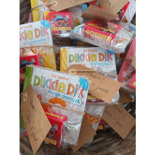 Ik heb zelf woezel en pip knijpfruit wikkels gemaakt. Ze gaan in een zakje met confetti, een ballon en op het zakje een woezel en pip sticker.