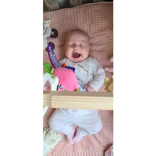 Ik krijg commentaar van het cb. Dat ze haar hoofdje nog niet omhoog houd. Ze rolt nu nog niet van rug of buik of anders om. Maar als ze dat straks wel doet. Wil ik geen ongelukken hebben in bedje. Dat ze haar hoofdje niet goed kan draaien.