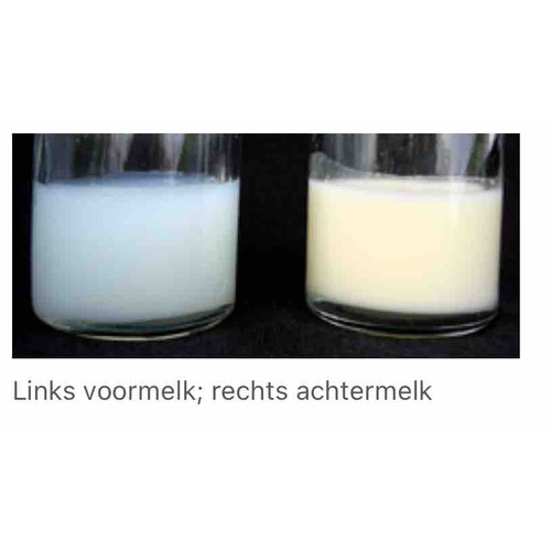Mijn melk is altijd gelig. Ik heb nog nooit dat soort wittige melk gezien bij mezelf. Heb vast niet alleen vette melk. Ik dacht dat het ook wat achterhaald was dat je altijd eerst alleen maar voormelk hebt en dan achtermelk. Dat ze nu denken dat het zich mengt.