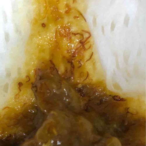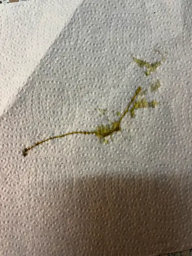 Mijn zoon had het zojuist ook, gisteren een halve banaan op… hij heeft het vaker, maar dan rode. Zijn net bloedwormen om te zien (ken ik van de paarden)… ik moet het opvangen en laten testen bij de huisarts, de keren hiervoor kreeg hij nog geen vast voedsel. Ik laat je weten als ik wat weet. (Ik heb evt wel een foto van vorige week, de rode ‘wormpjes’. Voor als je wilt vergelijken?