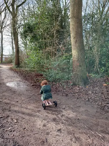 Bij de driewieler leert ze het trappen. Zelf trappen is nog te zwaar. Dus we hebben een met een duwstang.