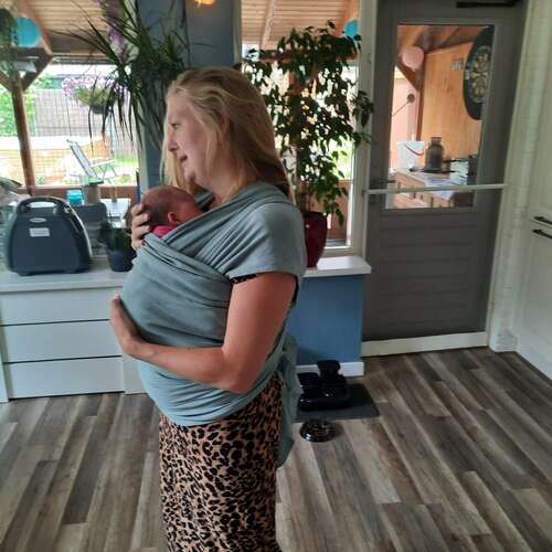 Geen draagdoek, maar een heel fijn alternatief, het womboo buidelshirt. Is een T-shirt met buidel waar de kleine in kan. Ideaal vind ik 'm, je laat de kleine er gewoon inglijden. Die van mij vind het heerlijk!