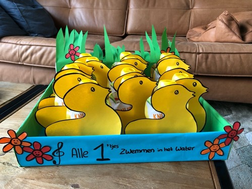 De Hema heeft maisstengels in de vorm van eendjes. Daarvan geef ik een handje in een cellofaanzakje samen met een badeendje (ook van de Hema). En op het zakje heb ik deze sluitstickers besteld: https://www.zelftraktatiesmaken.nl/a-73700856/stickers-gepersonaliseerd/sticker-er-is-er-eendje/#description . Ook de cellofaanzakjes en de cadeauzakjes voor de leidstertraktatie komen daar vandaan trouwens. Staan veel leuke dingen op, ook kant en klaar. Ook leuk om te kijken onder ‘foto’s van klanten’ voor inspiratie. De leidsters krijgen een zakje thee en wat mini Tony Chocolony’s in een leuk zakje.