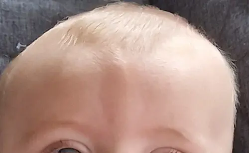 Hoi! Hier daadwerkelijk een blije jongeman met een milde vorm van wigschedel (= vroegtijdig gesloten voorhoofdsnaad). Wij zijn hiervoor nu twee keer in het Sofia Kinderziekenhuis geweest. Zeker bij de milde vorm doen ze hier niets mee, behalve monitoren 1x per jaar. Mocht je een soortgelijke richel herkennen, maak je dis vooral geen grote zorgen. Het schijnt zelfs te verdwijnen na een aantal jaar. Bij zorgen kan je altijd even je huisarts contacten voor een doorverwijzing natuurlijk.