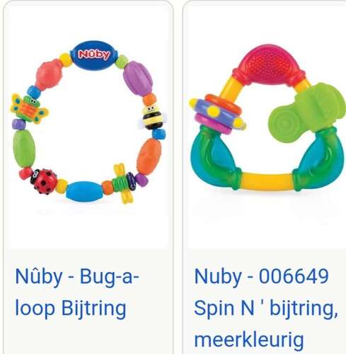 Wij hebben een bijtbal, heb je in alle kleuren soorten, vormen, en maten. Houd lekker vast en vind ze leuk om mee te spelen. Hebben er ook een loopy link ketting aan zodat we hem aan dingen vast kunnen maken en ze ermee kan rammelen.