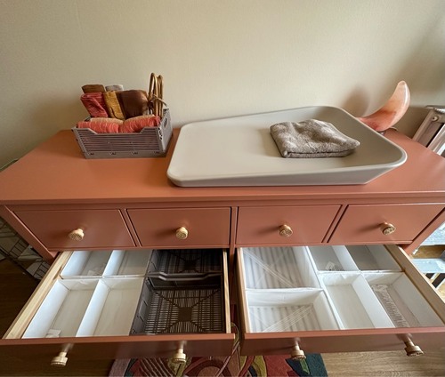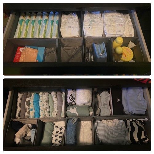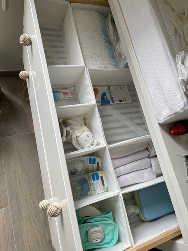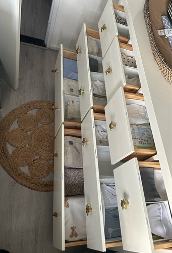 Weet je wat ik persoonlijk heel handig vond? Stel je voor dat je baby een spuitluier heeft gehad en op het kussen ligt. Dan wil je ideaal de lade met 1 hand kunnen open doen terwijl je met de andere hand de baby vast kan houden. Ik zou dus alle verschoon Essentials in de voorste vakjes leggen. Zoals bv een tetra doek om onder de baby te leggen als de kussenhoes helemaal vies is geworden (vaak doen ze een plasje als de pamper open gaat). En misschien ook Rompers in de bovenste lade. In het begin hebben ze het nog snel koud en liggen ze niet graag alleen in een luier, dan is het wel fijn als het snel vooruit kan gaan. Wij hadden ook een mandje met Pampers en doekjes en billenzalf boven op de commode staan, staat iets rommeliger, maar wel handig voor het snel kunnen verschonen. Maar vooral kijken wat je zelf gemakkelijk vindt natuurlijk, iedereen heeft ook andere gewoontes😊