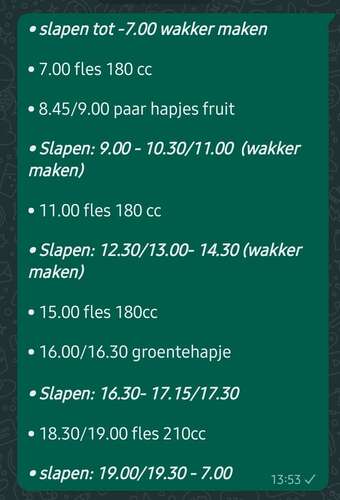 Zoontje is zondag 5 maand. We hebben niet een strak ritme we volgen hem hij geeft het allemaal wel aan op zijn eigen ritme.