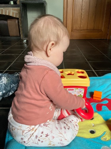 Zij is met kerst vanuit buikligging gaan zitten - dit is voor mij pas zitten dan, aanvankelijk viel zij nog wat om (we vingen haar 9/10 op), dag of 3 later zie je haar zittend spelend. Soms minuten lang, meestal is ze druk aan het verplaatsen en ze gaat tussendoor in zitpositie en zij gaat snel verder half tijgerend/kruipend/omrollend/aan stoel trekkend wereld verkennen 🥹🫶🏼