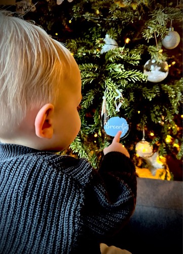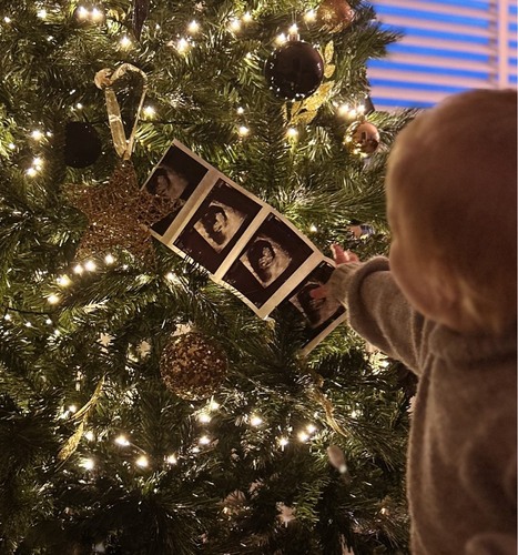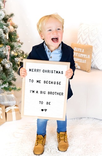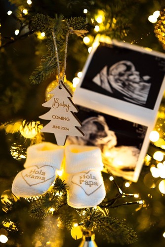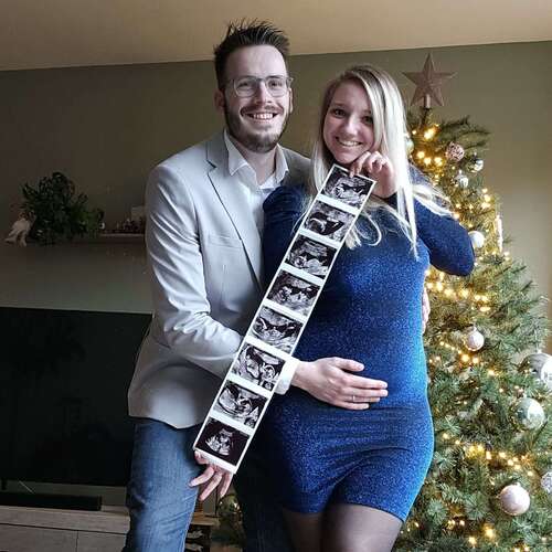 Op social media gaan we het 1e kerstdag bekend maken. We hebben een foto van ons 2 zittend voor de kerstboom met een kerstromper en de 13 weken echo gemaakt.