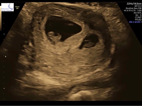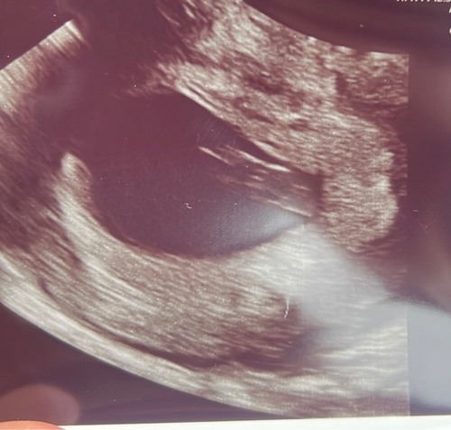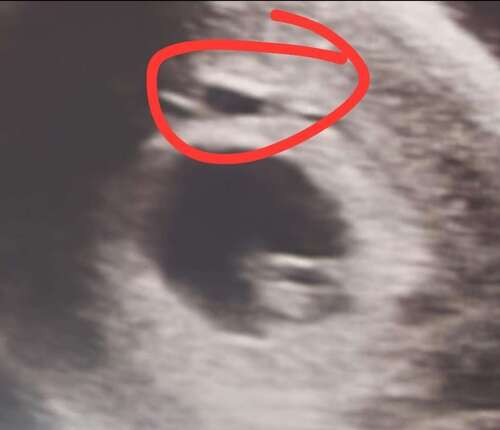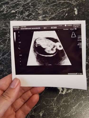 Mijn echo gisteren, uitwendig. Heeft iemand een idee wat het witte stipje bij baby B is? Bij baby A zag ik dit niet. Het viel mij net pas op.
