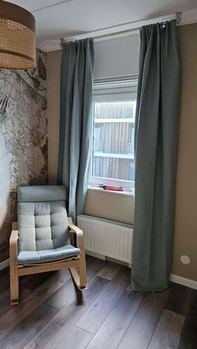 Wij hebben een schommelstoel van Leen Bakker die vrij compact is en zit lekker: Anada. Hij is niet hoog, dus als je een beetje wilt dommelen dan wordt het lastig.