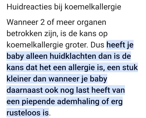 Ik ben toch maar weer koemelk vrij gaan eten… Heb dit een maand gedaan en toen weer een week een beetje gaan eten maar nu met deze reactie (uitslag zit ook op buikje nu een beetje) en moeilijkere dunne zuurdere ontlasting en schrale wangetjes toch KMA vermoeden. Lastig allemaal hoor want kan ook zijn dat z’n tandjes nu doorkomen bijvoorbeeld. Maar dat verklaart weer niet de uitslag.