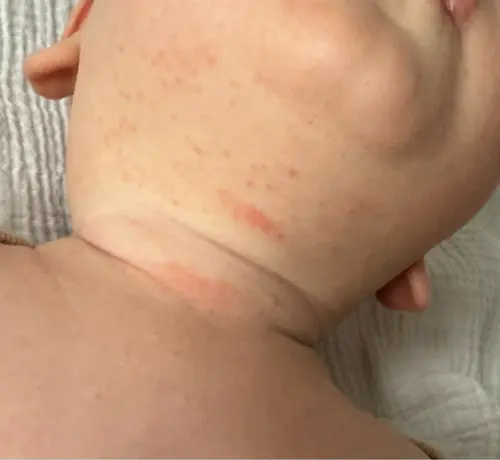 Jaa hier ook eerst alleen in nek / onder kin maar nu ook beetje op borst en zelfs rug. Echt vervelend. Hoop niet dat het jeukt voor hem…