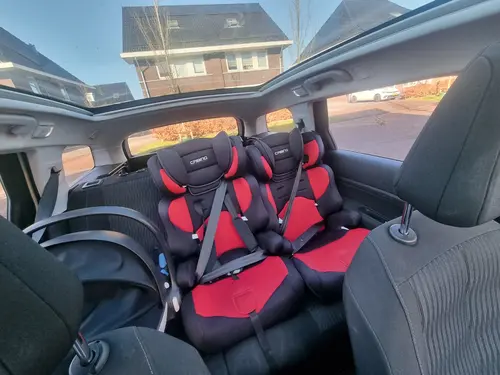 Ze zitten allebei in een groep 3 auto stoel met gordel maar wel specifiek een stoel gezocht die smal is! Je hebt echt smalle en bredere varianten. Het past net achter in. Wellicht gaat de oudste nog alleen op de verhoger als ze dat prettiger vind en zij gaat dan in het midden.