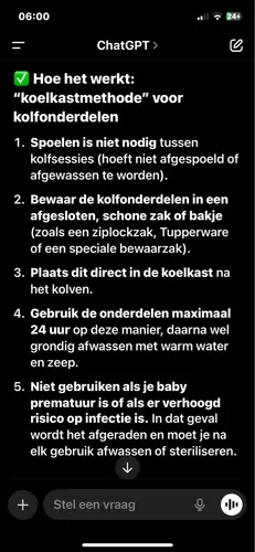 Als je vaker kolft op een dag, bewaar je kolf in de koelkast en was pas einde van de dag. Scheelt tijd.