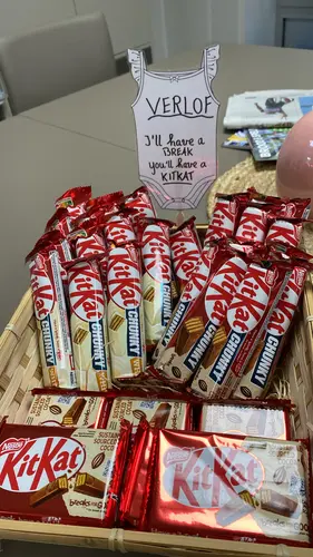Ik had een dikke vette snoeppot gehaald en daar het briefje opgeplakt met: “I’ll have a break you’ll have the KitKat”. Ik begreep dat collega’s er een extra rondje voor om liepen om een KitKat te halen 😂