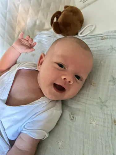 Mijn zoontje is 5 weken en 1 dag. Hij kan nu al 3 weken lang zn hooft ophoog houden, als hij bij ons op de borst ligt en als hij op bed op zn buik ligt. Hij lijkt het heel fijn te vinden om op mn borst te liggen en me dan aan te kijken en om zich heen te kijken. Ziet er zo grappig uit een baby die zo sterk is in zn nekje😂 Hij lijkt nu ook een beetje zn echte lach te laten zien🥰
