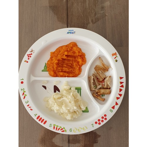 Dit is het bordje wat mijn zoontje at met ongeveer 6 maanden. Wel gepureerd, maar ook stukjes erin. Groente apart van vis, vlees, vega en rijst, pasta en aardappelen, zodat ze de smaak goed leren proeven. Ik combineer eigenlijk alles met elkaar, zolang er van alles maar iets is, groente, bijgerecht en vis, vlees oid!