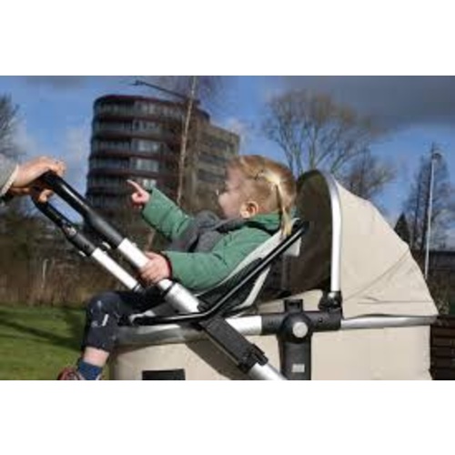 Wij hebben een dubbele kinderwagen, maar de oudste ging ook wel is in de gewone kinderwagen en de jongste dan in de draagzak. Lag er maar net aan waar de rit naar toe ging.