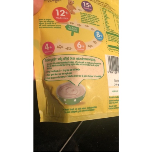 Wij hebben deze pap eerst gegeven als papfles met opvolg melk, maar later met gewone halfvolle melk.
