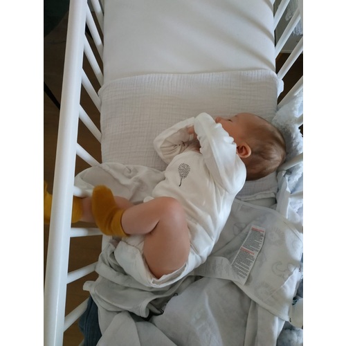 Kort opgemaakt maar bijna met zijn billen tegen de onderkant van de wieg... en hoofdje onder de bovenkant dekens