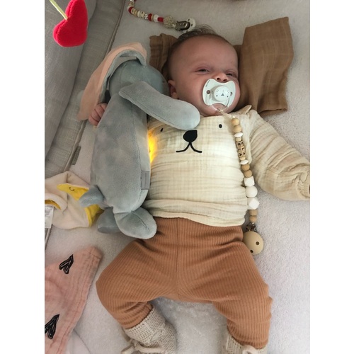 Super tevreden over. Vreet batterijen, maar die gaat als als ons zoontje beetje begint te huilen, en stopt na 20min vanzelf. Het helpt wel om hem verder te laten slapen als het alleen maar jengelen is. Zit baarmoeder geluid in en nog wat andere geloof ik, met een rood lichtje. Nu hij wat ‘ouder’ is (12 weken) kijkt hij er ook gefascineerd naar, en valt dan vaak weer in slaap. 🙂