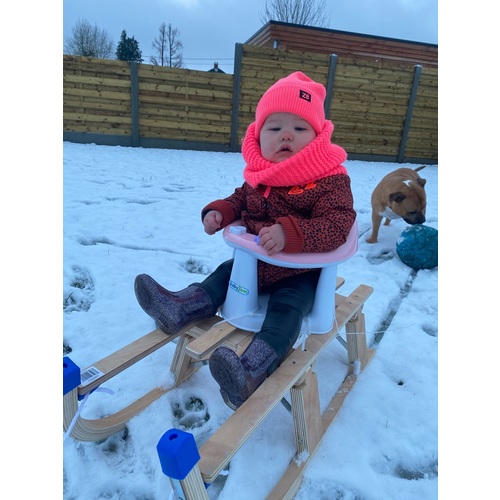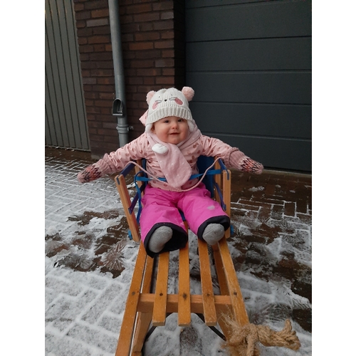Hier ging het een week of drie terug al heel goed op zo'n plastic slee. Zoonlief was heel voorzichtig met haar. Ze kan overigens wel echt heel goed zitten
