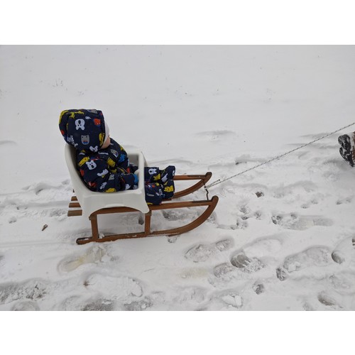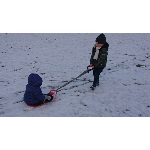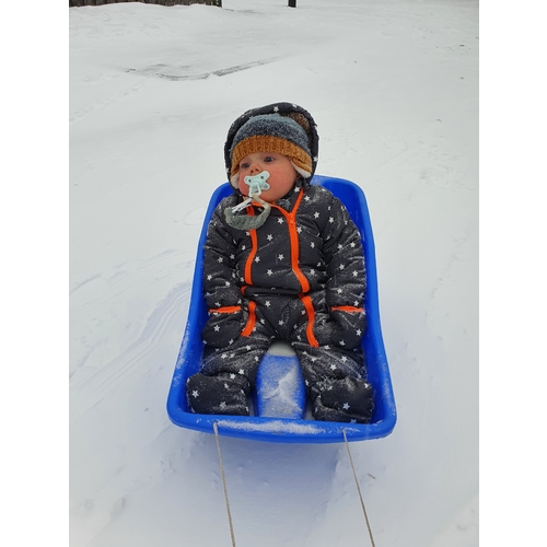 Wij konden gelukkig een slee van de buren lenen. Hij vond er niet zo veel aan... Net zijn moeder, die kijkt liever binnen bij de verwarming hoe anderen in de sneeuw bezig zijn 馃ぃ